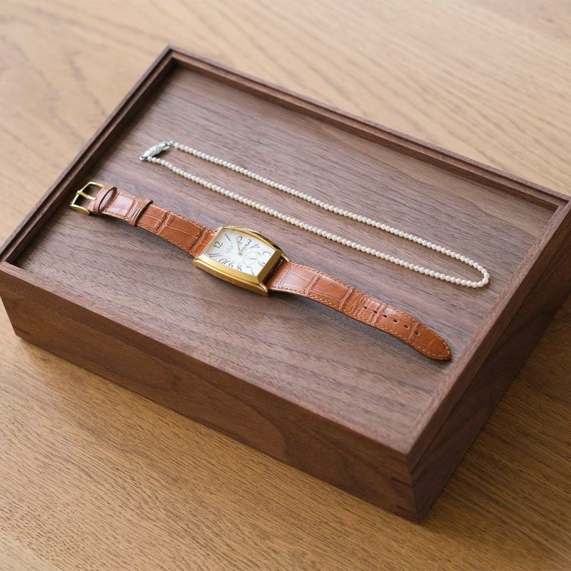 蓋と本体・ベロア仕切りがセットのジュエリーケースです。蓋のフチには高さがあるので、トレイとしてジュエリーを置いても良し、下のケースはお持ちのジュエリーの量に合わせてケースを購入していただくと、ご自分だけのパーソナルなジュエリーボックスがつくれますね。