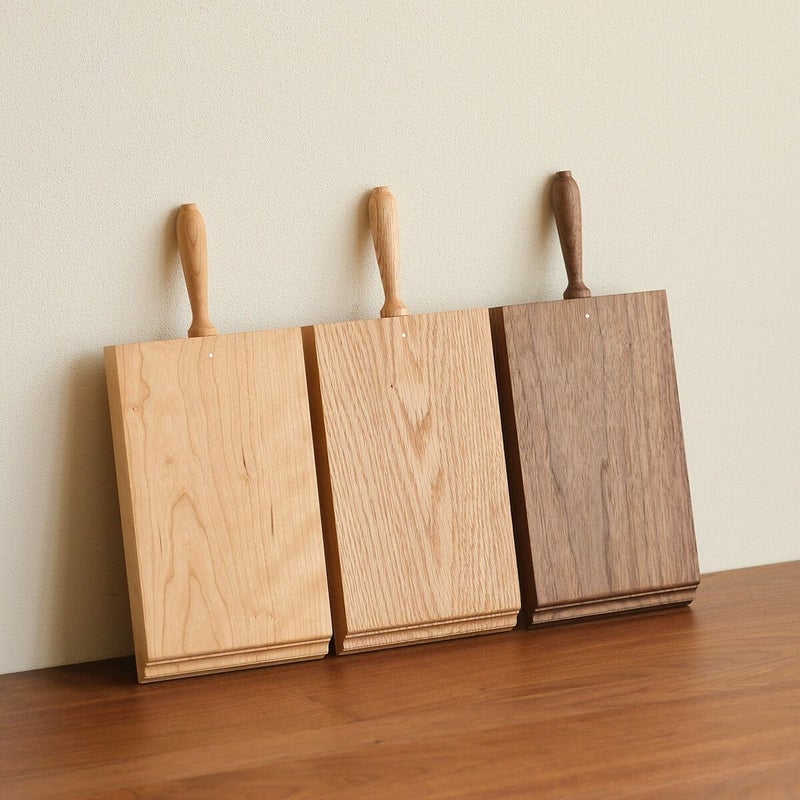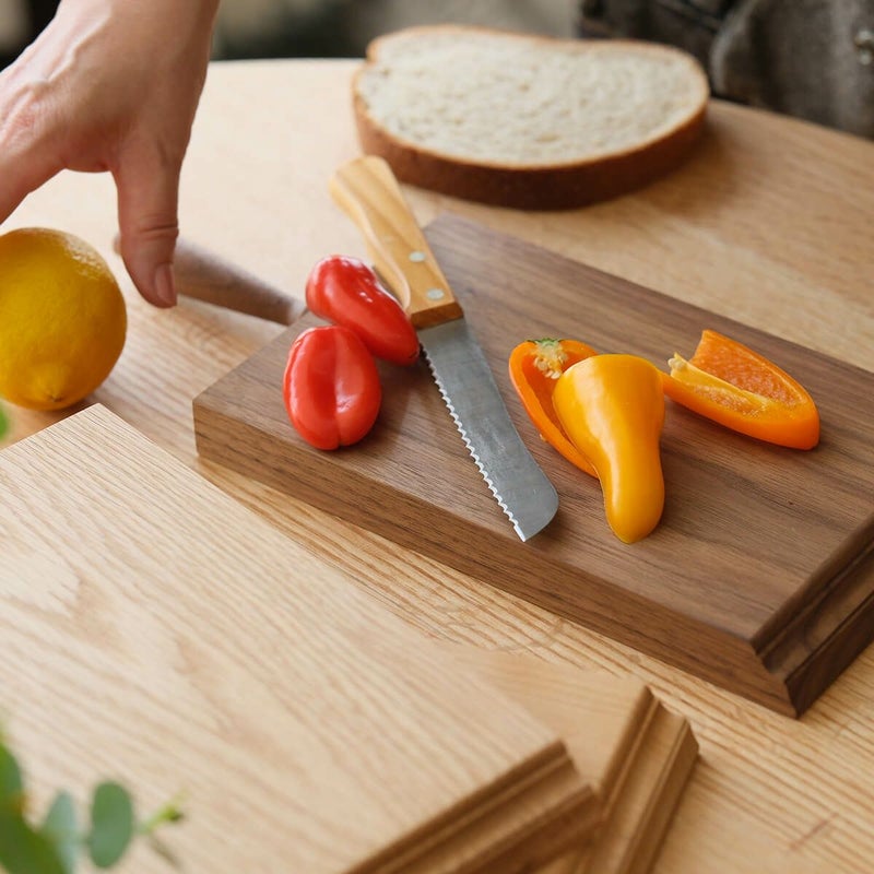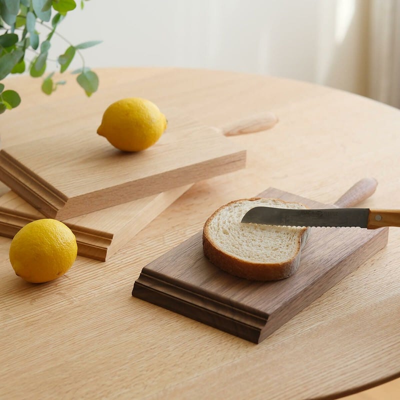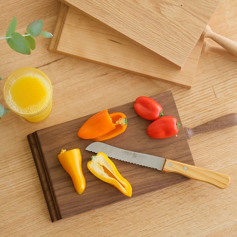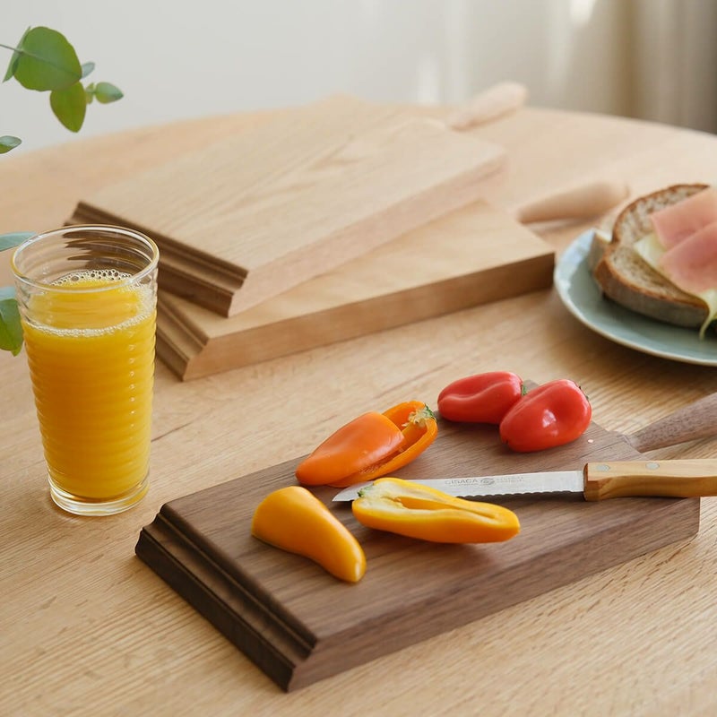 持ちやすいハンドルとボードの端の波カットがデザインポイントの、テーブルに置くだけでさまになるカッティングボード。食材をカットしながらのオープンサンドなんかも、ブランチに楽しいですね。