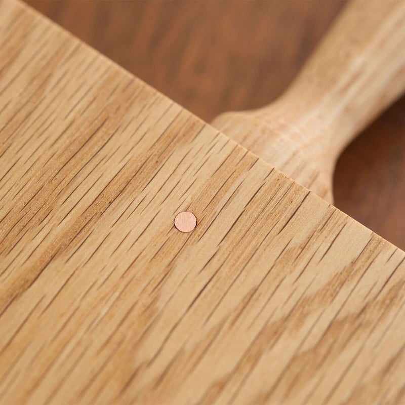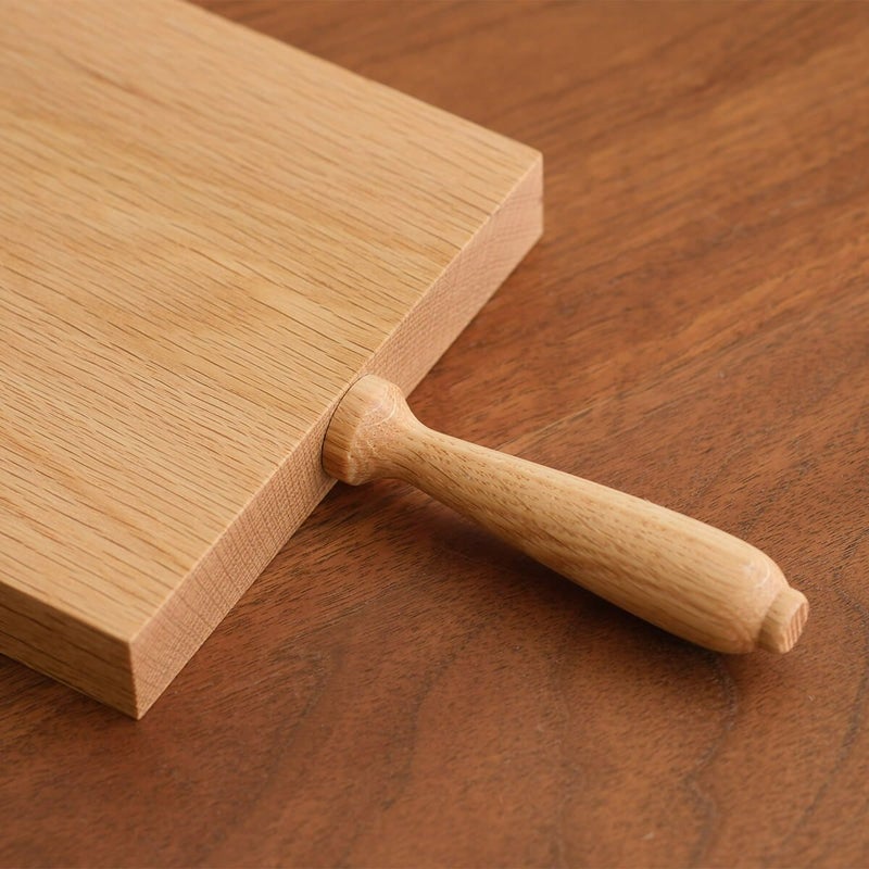 持ち心地が良いように磨きを丁寧にかけた持ち手部分は、真鍮の金具でとめてあるのがこだわりポイント!小さなことですが、カッティングボード全体のバランスを壊さないように細かいところにも職人がこだわって作っています。