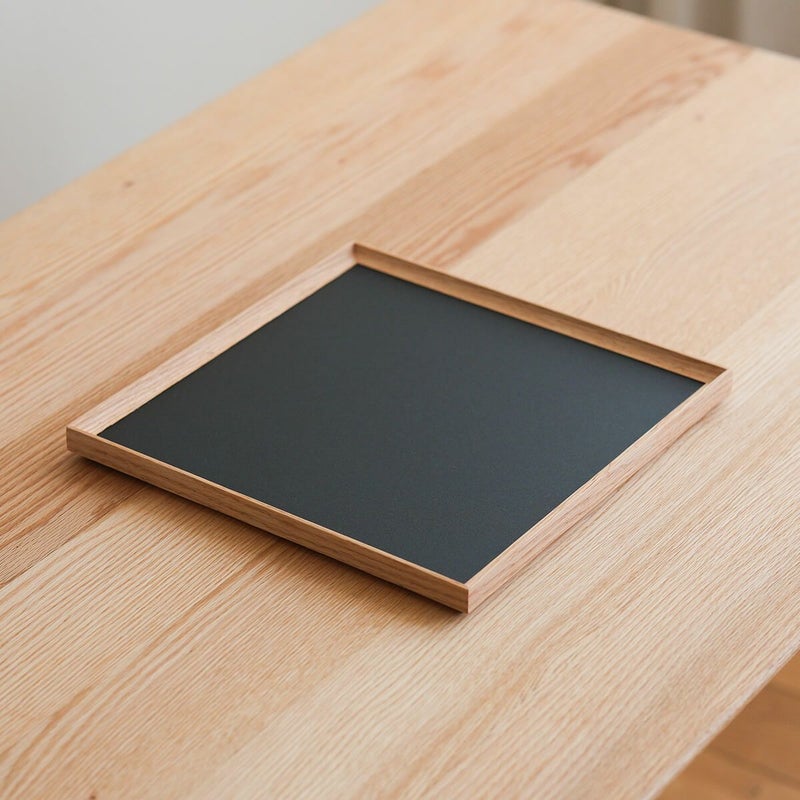いつものお茶の時間がさらにおいしくなりそうな、使いやすいトレイです。正方形のサイズは、カップとスイーツのお皿を一緒にのせるのに丁度良いサイズ。もちろん、普段の食事シーンにも活躍しそう。天板は亜麻仁油から出来たリノリウム素材で、優しい使い心地です。