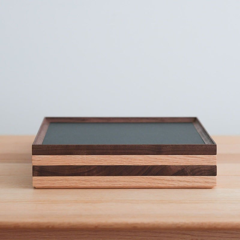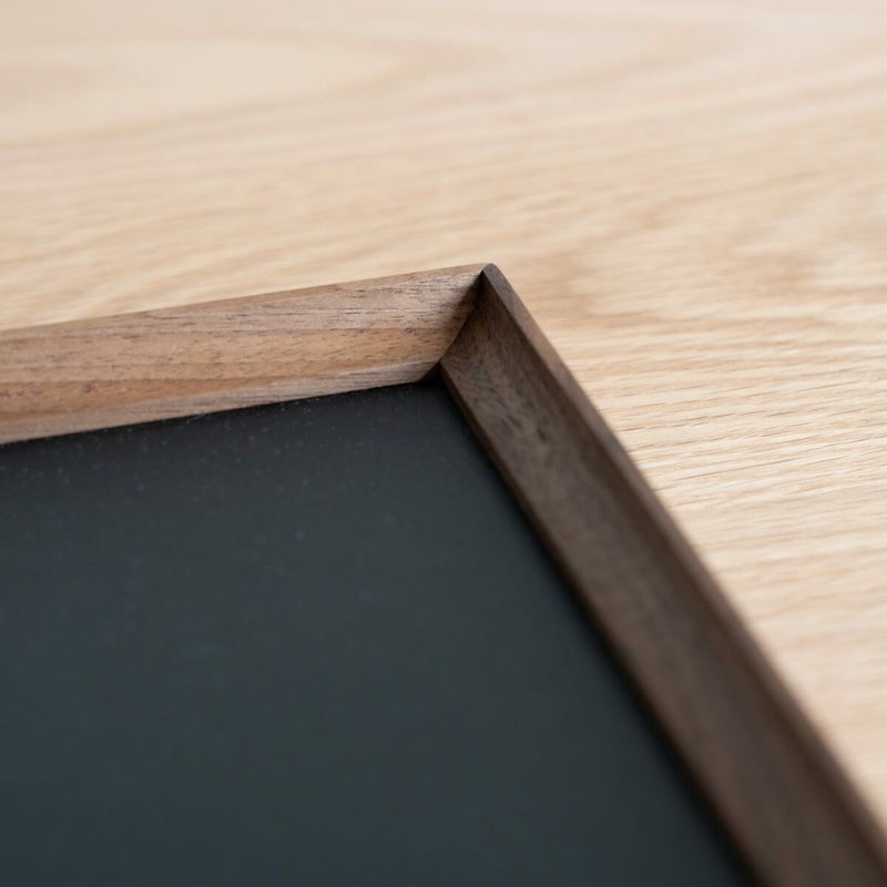 和食器と洋食器、どちらにも合わせやすい、ウォールナットとオークを使っています。長くお使いいただくため、お手入れは水洗いを避け、汚れた場合は固く絞ったふきんで拭き取ってください。時々、クルミオイルやオリーブオイルで枠の部分をお手入れすると、木肌が保護され塗装が長持ちします。