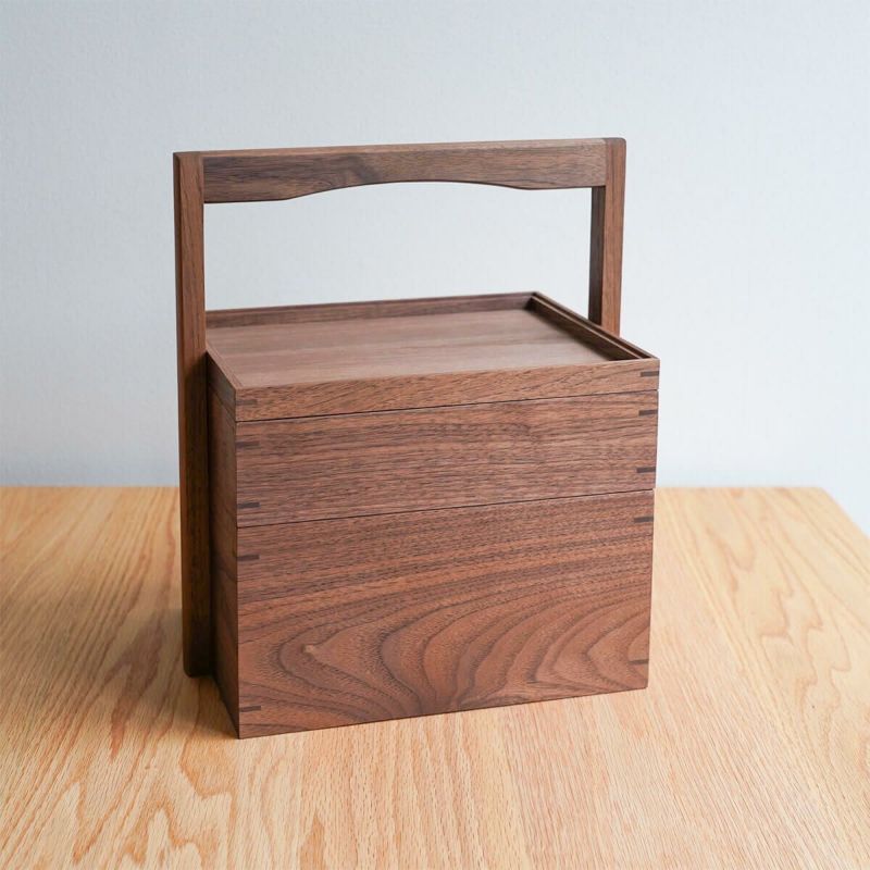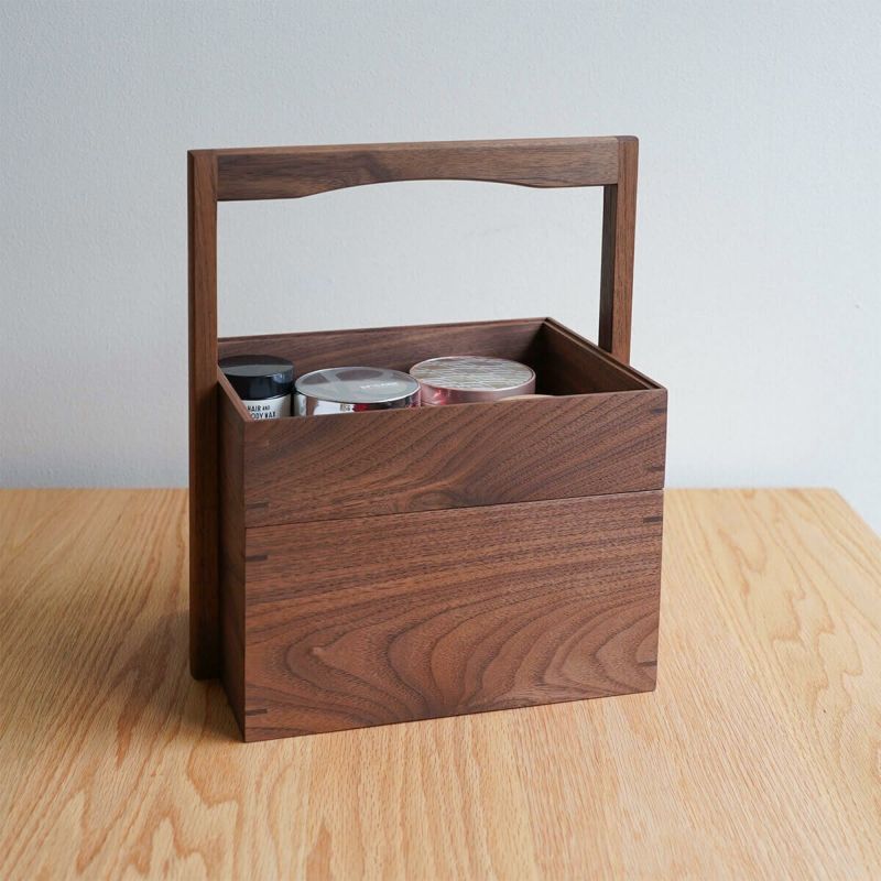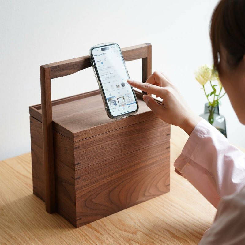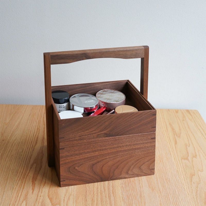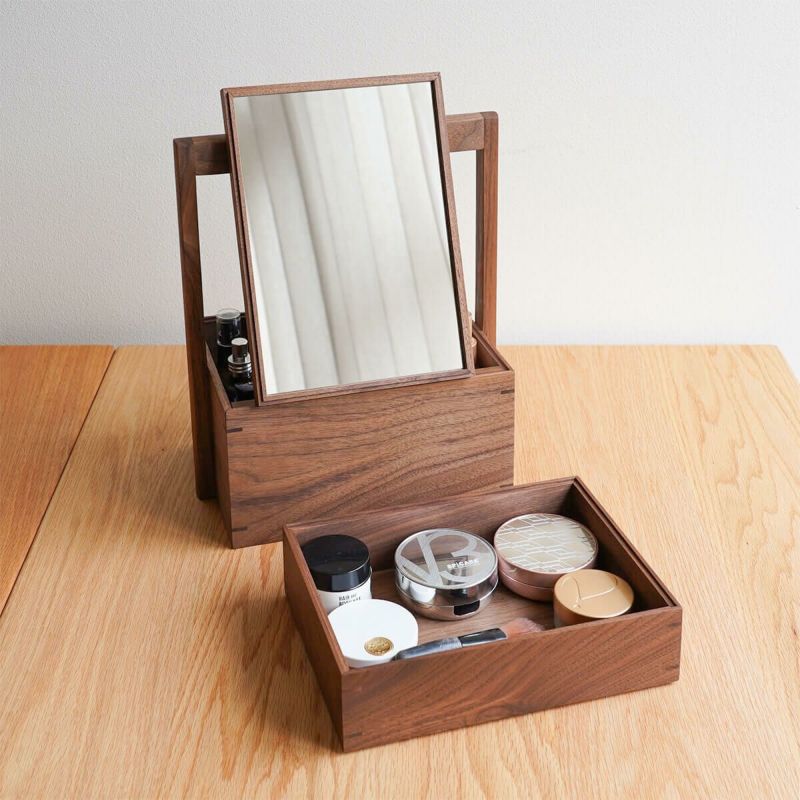 「こんなの探してたの!」と好評のこのメイクアップボックスはウォールナットで出来ているので、シンプルで大人女子が素敵に使えるデザインです。机の上にトレイを重ねたスタンバイ状態で置いて、携帯電話を立てかけてインスタライブなどを見ることもできるんですよ。
