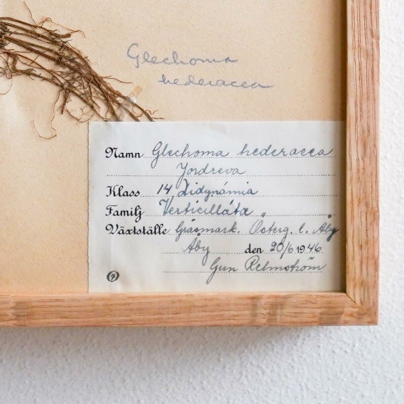 vokkoさんがスウェーデンで買い付けたこの標本は、1944-46年の間にスウェーデン国内で製作された植物標本。長年ファイルに挟んだ状態で保存されており保存状態がよく、まだほんのり緑やお花の色が残っています。ラベルには、名前、科目、生息地、採取日などが記載されいています。標本の詳しい背景は分からないのですが、植物の分類学を始めたのがスウェーデン人のカール・フォン・リンネ博士ということもあり、植物学が盛んな国の標本の1つです。