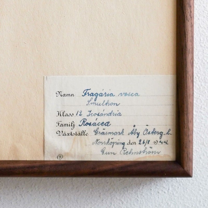 vokkoさんがスウェーデンで買い付けたこの標本は、1944-46年の間にスウェーデン国内で製作された植物標本。長年ファイルに挟んだ状態で保存されており保存状態がよく、まだほんのり緑やお花の色が残っています。ラベルには、名前、科目、生息地、採取日などが記載されいています。標本の詳しい背景は分からないのですが、植物の分類学を始めたのがスウェーデン人のカール・フォン・リンネ博士ということもあり、植物学が盛んな国の標本の1つです。