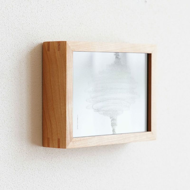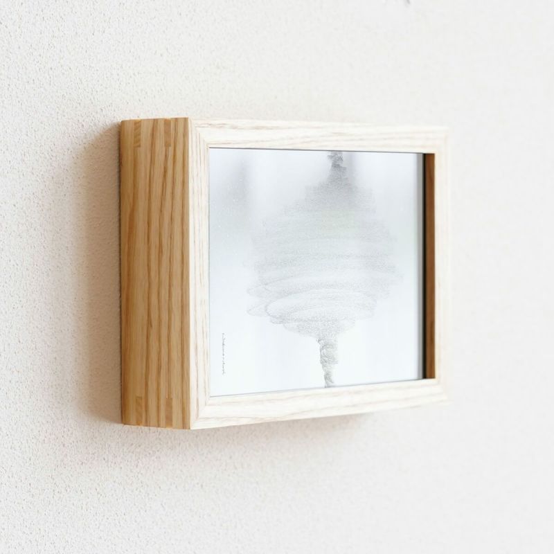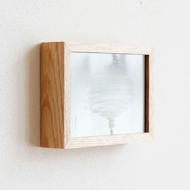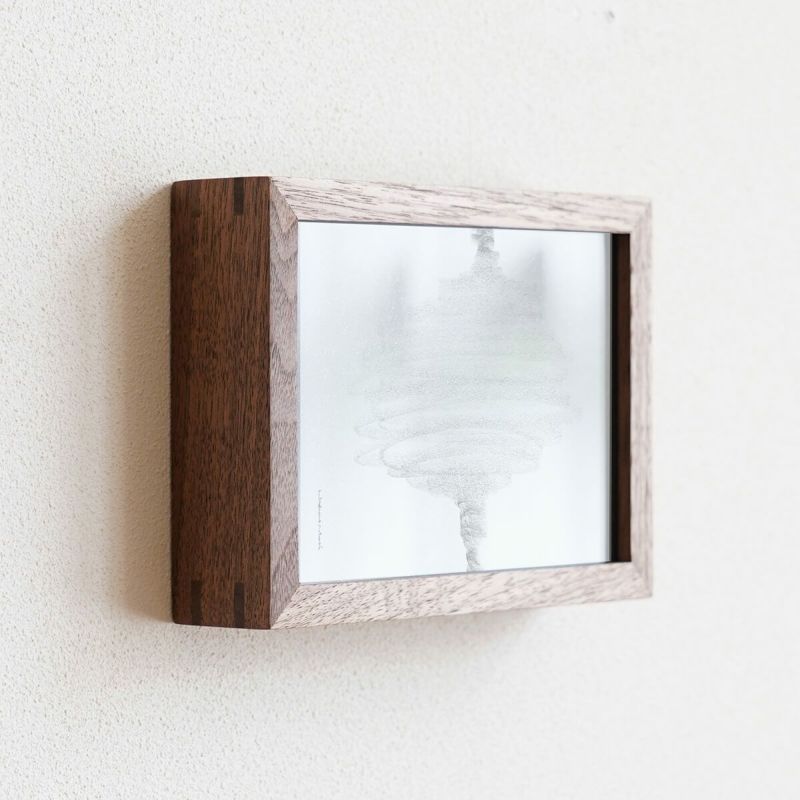 長年額縁を作ってきたメーカーだからこそ生み出せる、シャープな美しさ。木材の両端を斜め45°にカットして寸分のズレなく接合する、留め具には金具ではなくチギリ(木製部品)を使って強度とデザイン性を高めるなど、熟練の技術が詰め込まれたフレームです。