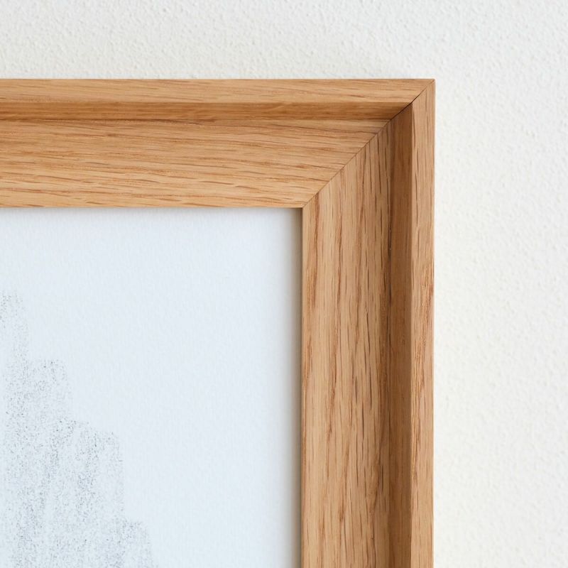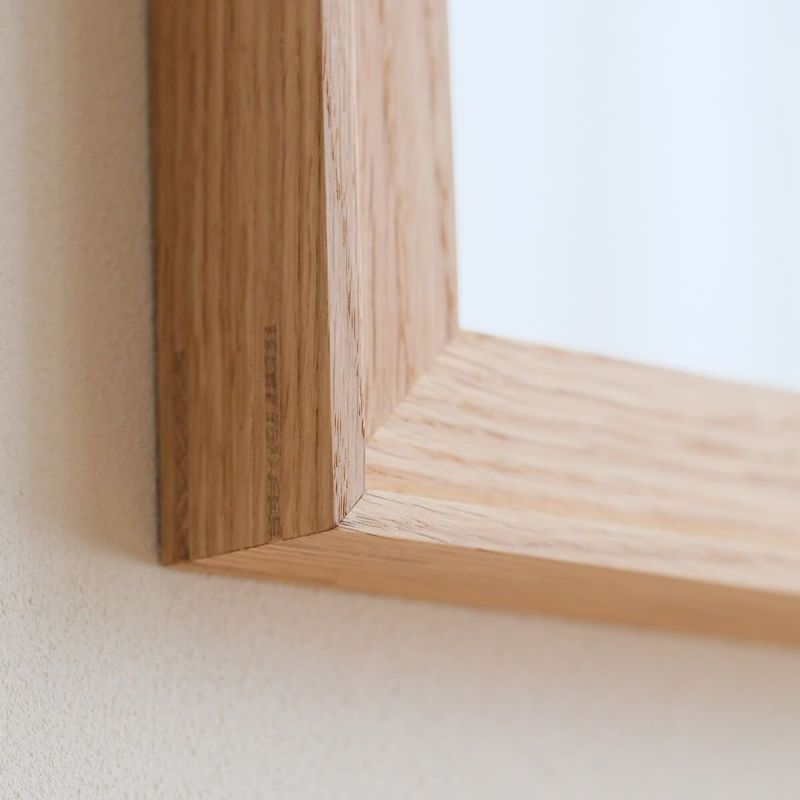 無垢材ならではのナチュラルな風合いと、ていねいな研磨作業が生み出すマットな質感が魅力。額縁らしい重厚感のあるフォルムが、作品を引き立たせてくれます。 アクリル板をガラスやミラーに変更することも可能です(有料)。