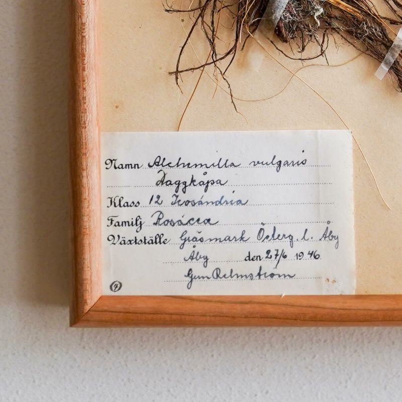 vokkoさんがスウェーデンで買い付けたこの標本は、1944-46年の間にスウェーデン国内で製作された植物標本。長年ファイルに挟んだ状態で保存されており保存状態がよく、まだほんのり緑やお花の色が残っています。ラベルには、名前、科目、生息地、採取日などが記載されいています。標本の詳しい背景は分からないのですが、植物の分類学を始めたのがスウェーデン人のカール・フォン・リンネ博士ということもあり、植物学が盛んな国の標本の1つです。