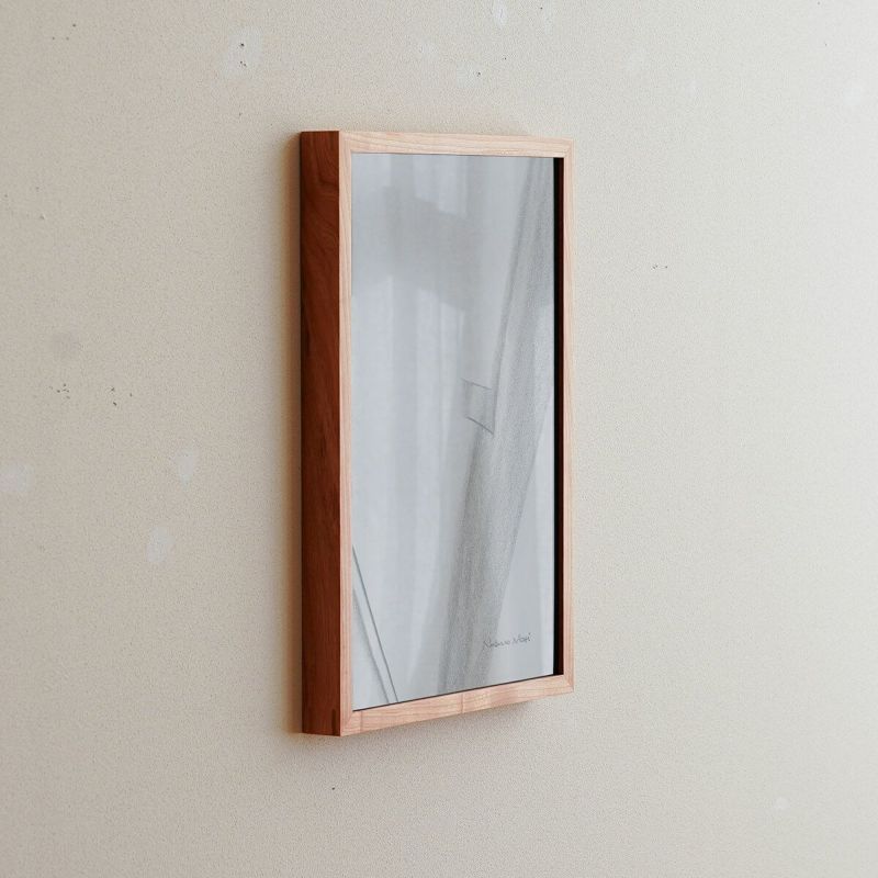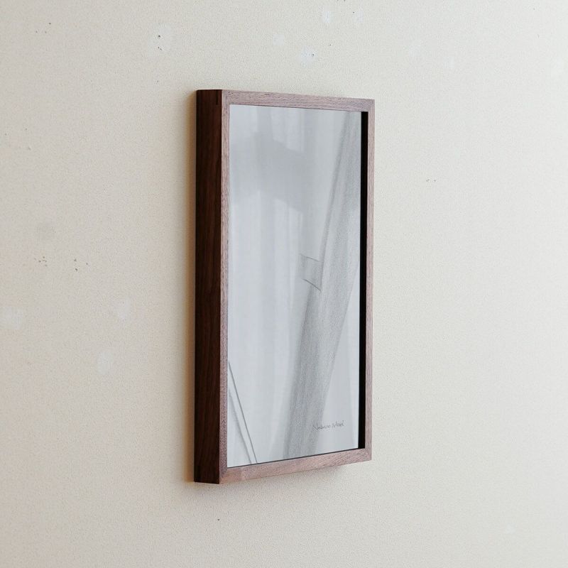 長年額縁を作ってきたメーカーだからこそ生み出せる、シャープな美しさ。木材の両端を斜め45°にカットして寸分のズレなく接合する、留め具には金具ではなくチギリ(木製部品)を使って強度とデザイン性を高めるなど、熟練の技術が詰め込まれたフレームです。