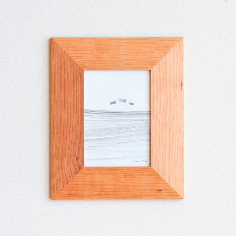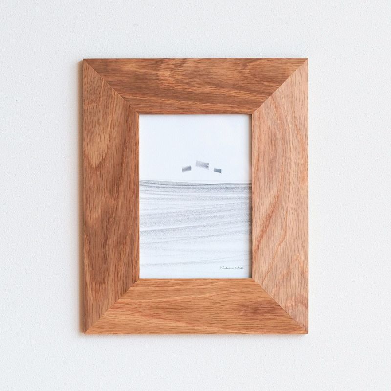 無垢材ならではのナチュラルな風合いと、ていねいな研磨作業が生み出すマットな質感が魅力。個性あるデザインが一見目をひきますが、逆傾斜型の縁が作品を引き立たせてくれます。 アクリル板をガラスやミラーに変更することも可能です(有料)。