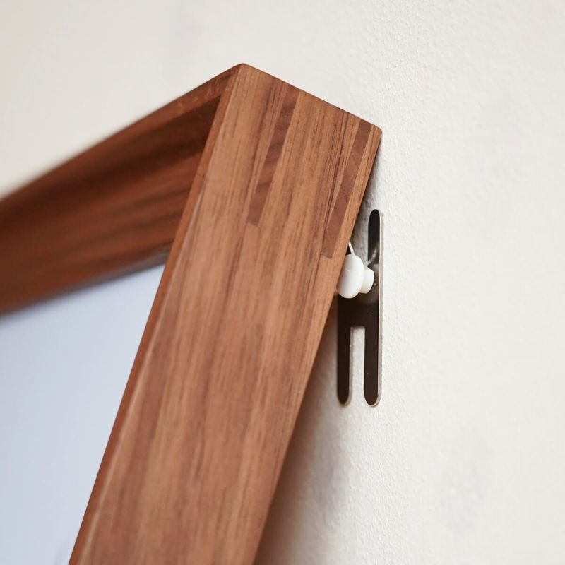 紐を使わず、フレーム本体を付属のビスまたはピンに引っ掛けるだけの簡単設置。思い通りの位置に飾ることができ、左右の高さがズレることもありません。フレーム内側には吊り下げ用の溝が施されているので、安定性も抜群。さらに留め具が壁に直接当たらない構造となっており、壁とフレームの間に無駄な隙間ができないためインテリアとしても優秀です。