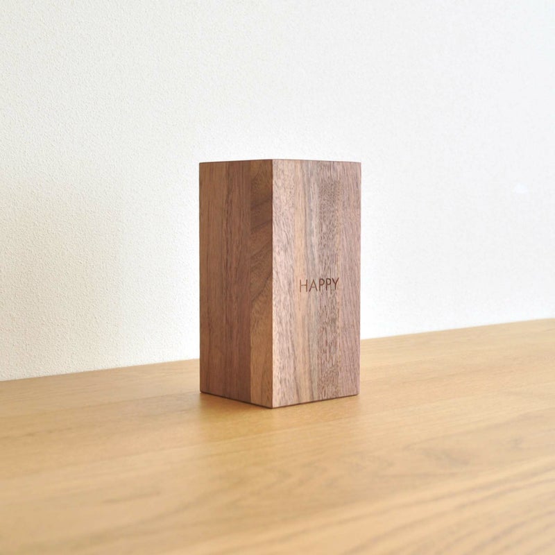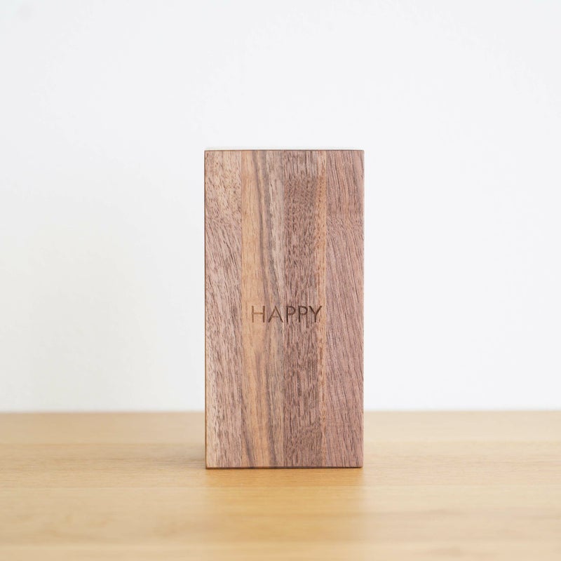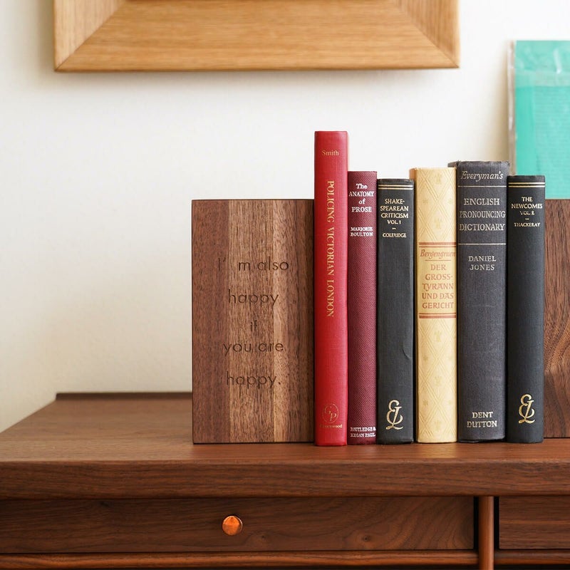 重みのある木製ブックスタンド。表面には、メッセージが英語でレーザー加工してあります。