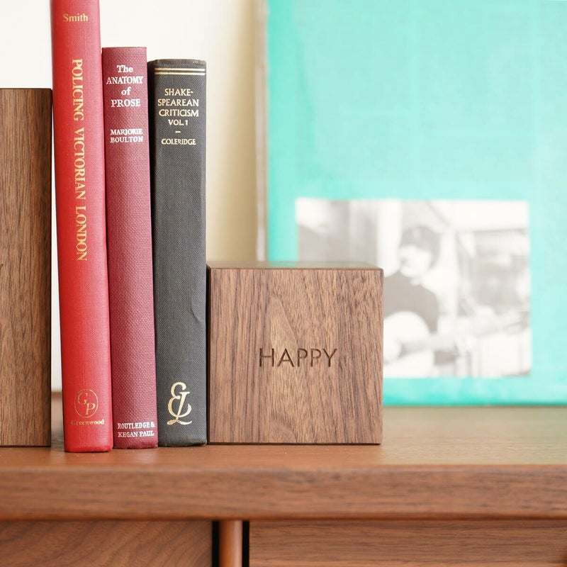 小ぶりサイズの木製ブックスタンド。表面には、メッセージが英語でレーザー加工してあります。