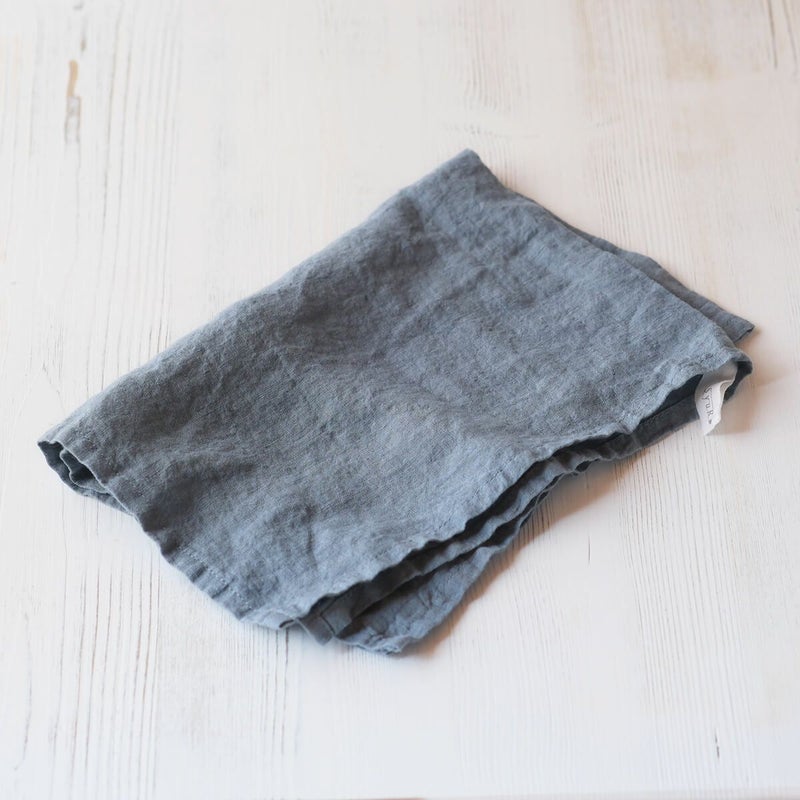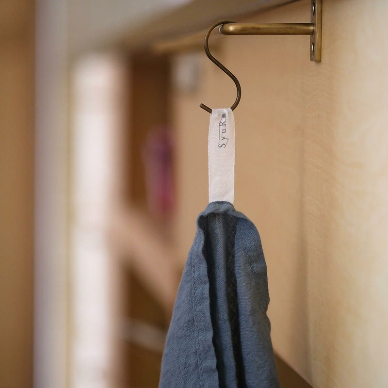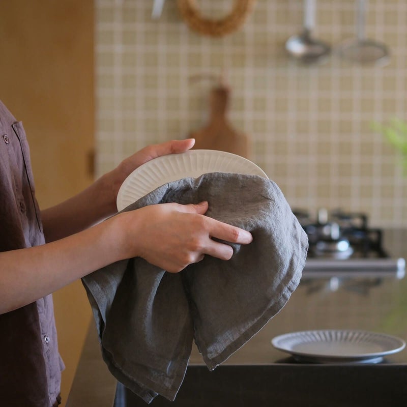 浜松で丁寧に織られたリネン100%の生地に、SyuRoの器に合わせたカラーの染めを施しました。使い込んだくたっと感を出すため洗いの工程にこだわり、さらにベッドリネンを専門とする工場で丁寧に縫製しています。食器拭きや手拭きはもちろん、ランチョンマットとしてもお使い頂けるサイズです。