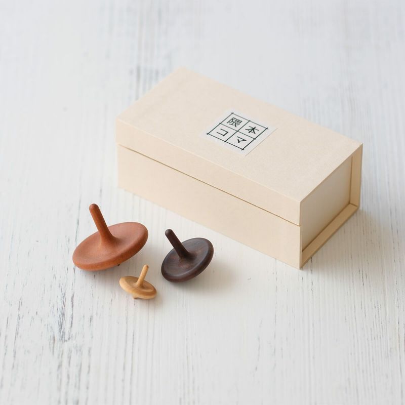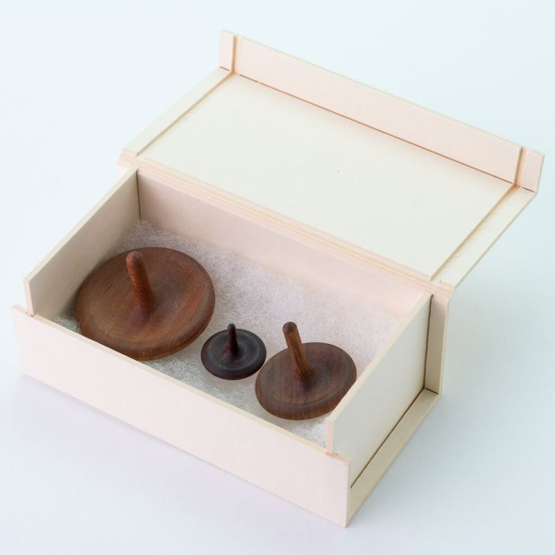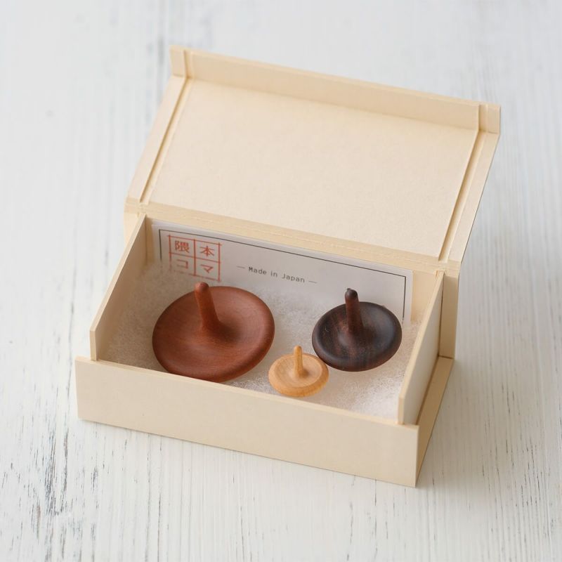すべて手作業で削り出された、美しい木目の手回しコマです。コマの美しさと楽しさを普段の生活の中で手軽にあじわえるよう、銘木で美しくデザインしました。大・中・小の3つの大きさのコマがセットになっています。小さくなればなるほど、軽く素早く回る楽しさは格別です。化粧箱入り。材質はお任せ下さい。