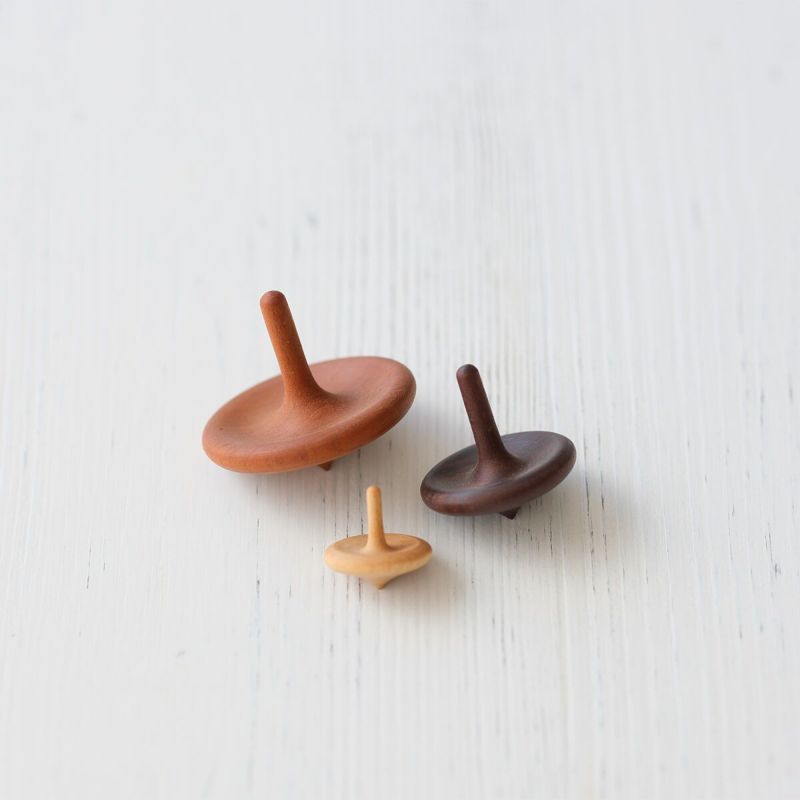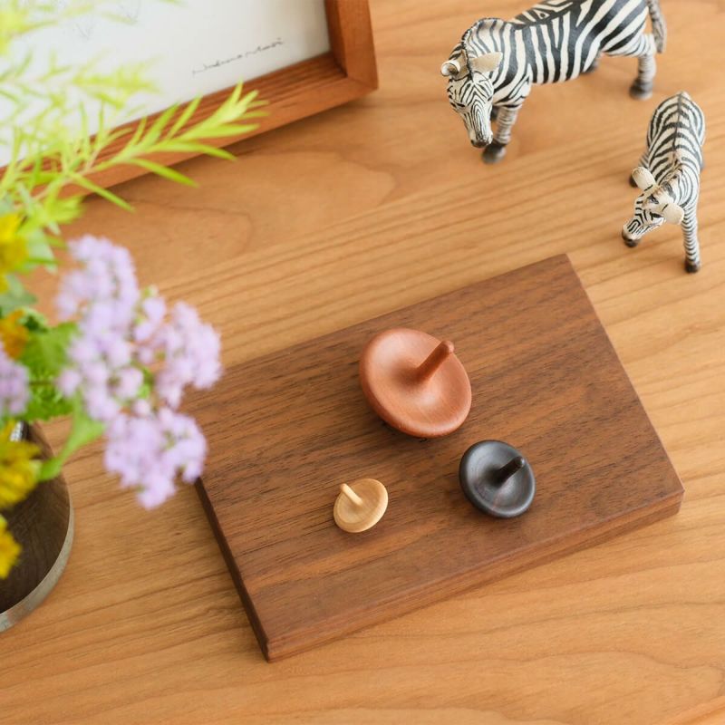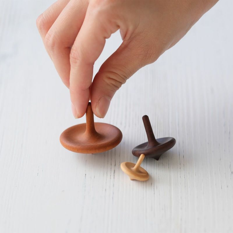 コマらしい王道の形が特徴の「きのこコマ」。柔らかな曲線と繊細な薄さのバランスが美しく、子どもから大人まで幅広い年代に人気があります。木目の美しさや、コマに適した重さとなることを基準に厳選した、世界の銘木を使用しています。