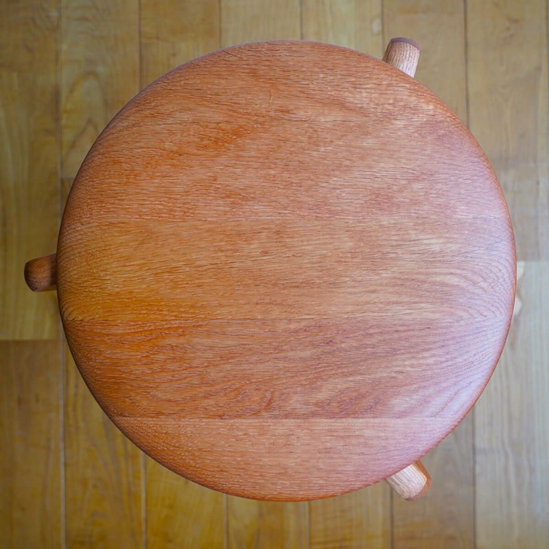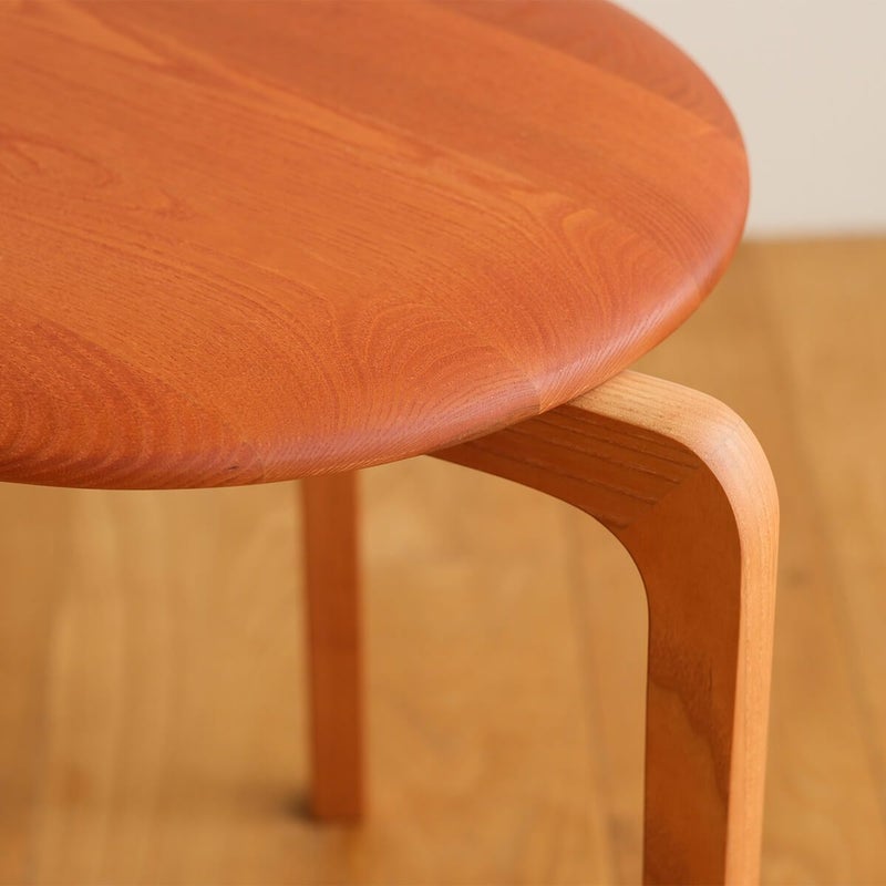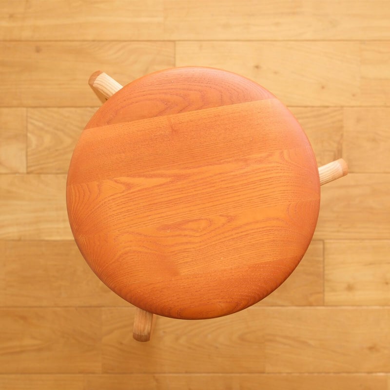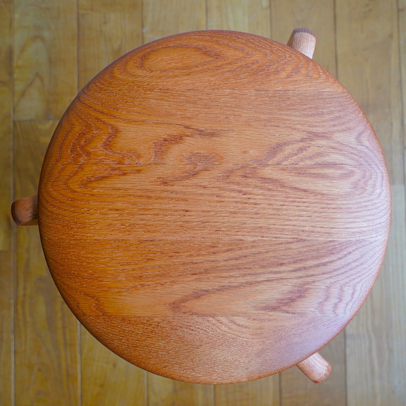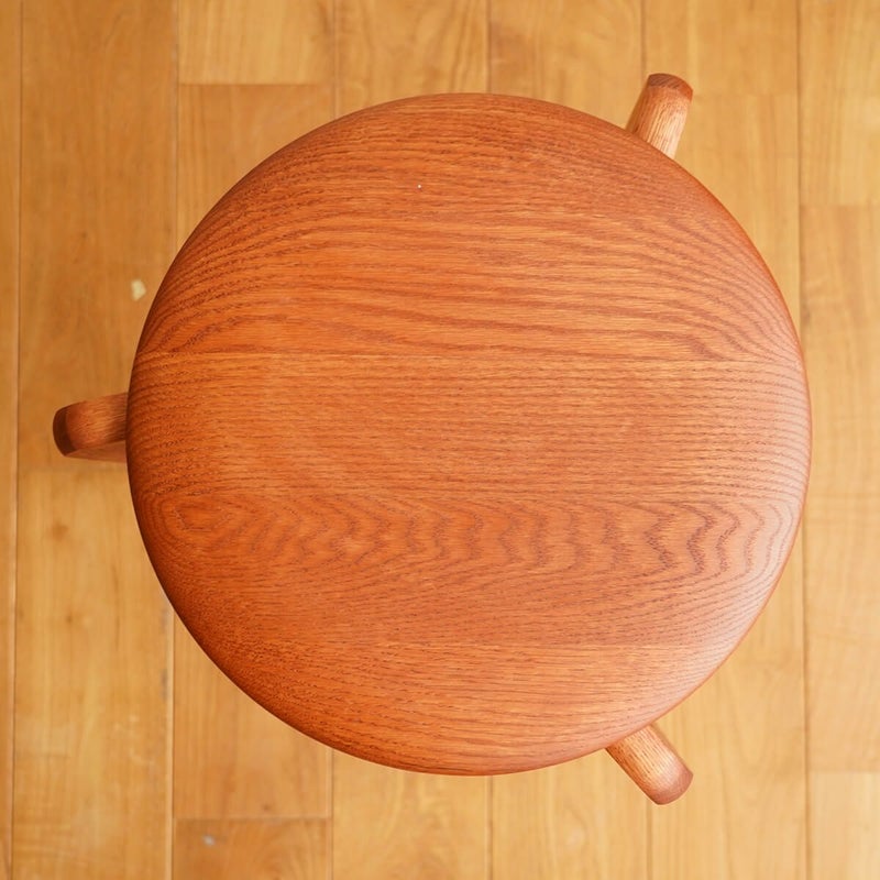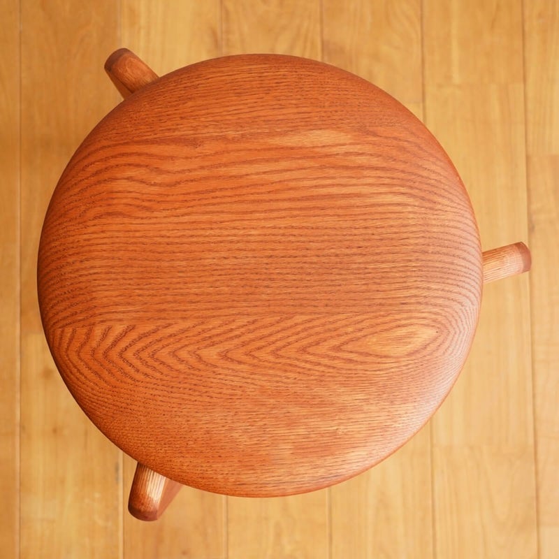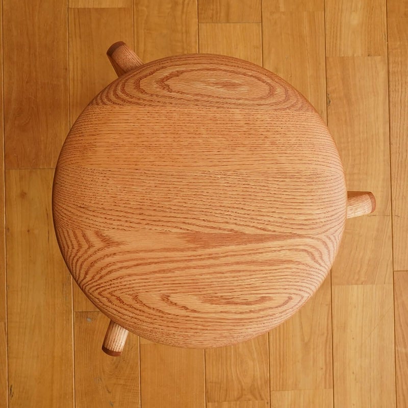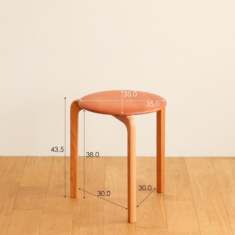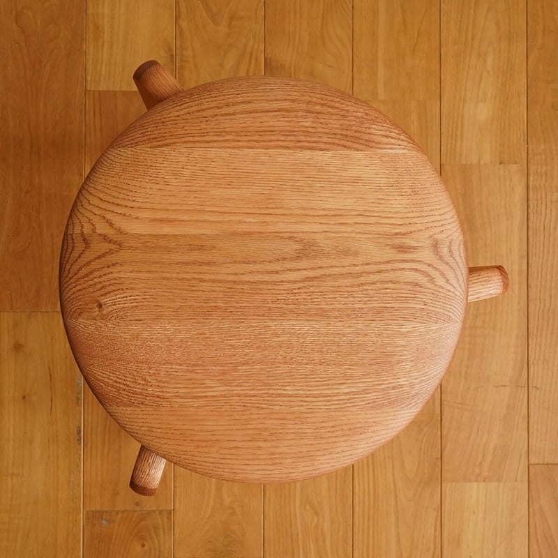 無垢材を使った、3本脚のスツールです。脚部は額縁の留め技術を使った仕様で、それらを3方向から組んだ形になっています。その無駄のない美しさと絶妙なR(曲線)は、熟練した職人の技術で作られています。強度があり座面をしっかりと支えてくれるため、安定感のある座り心地となっています。