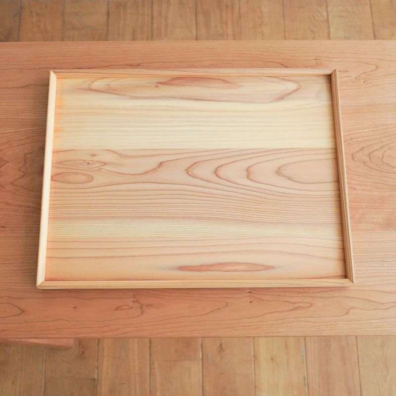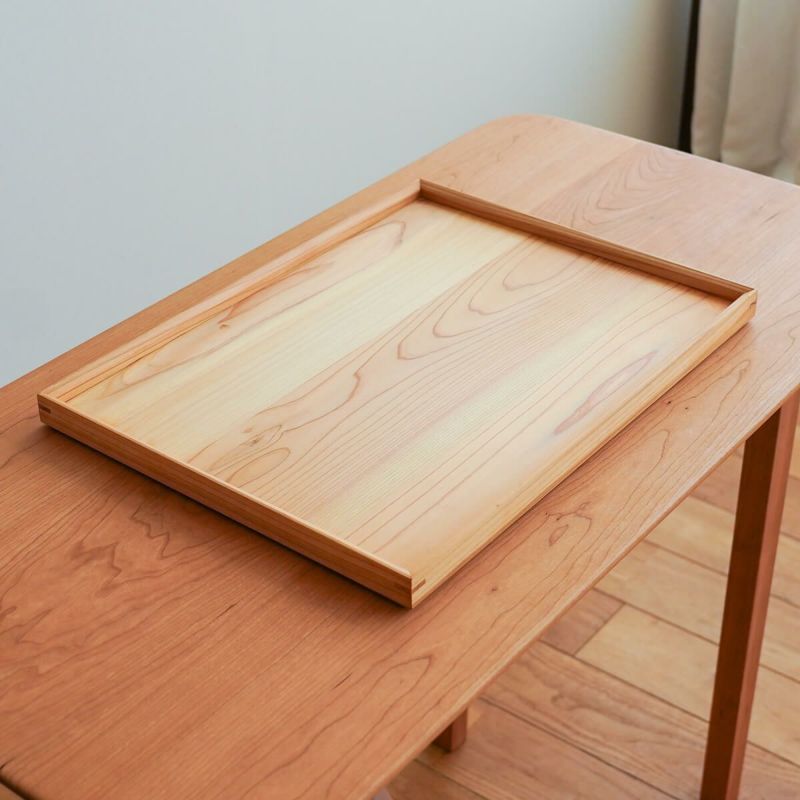 このトレイは毎日の食事時間が少し丁寧になりそうな、使いやすいトレイです。ワンプレートご飯と飲み物を組み合わせていいかんじ。天板は亜麻仁油から出来たリノリウム素材で、優しい使い心地です。