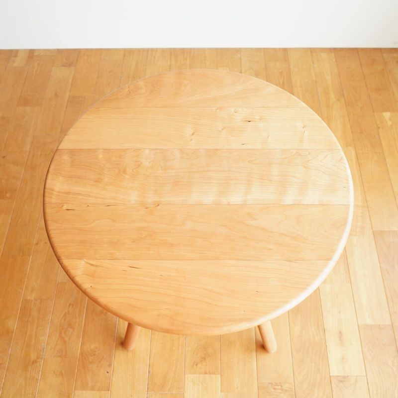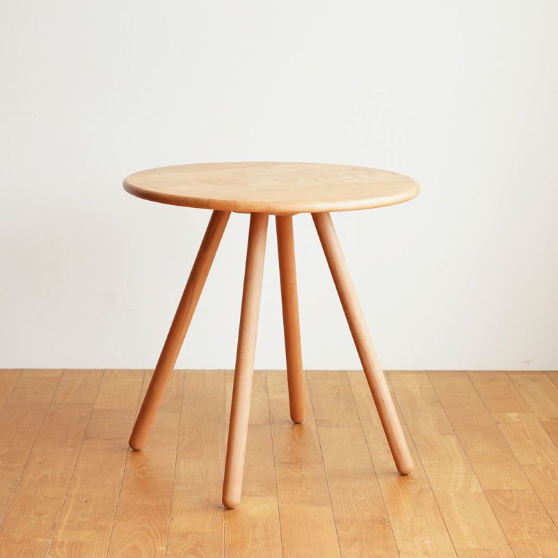 ミニマムサイズながら掛け心地がよい、すっきりとしたシルエットの円形テーブルです。天板裏にある接合穴に脚を差し込み、回すだけで完成。工具は一切必要ありません。
